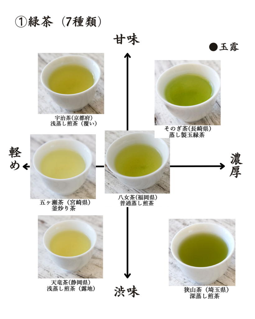 →玉露、そのぎ茶、天竜茶、八女茶、宇治茶、狭山茶、五ヶ瀬茶