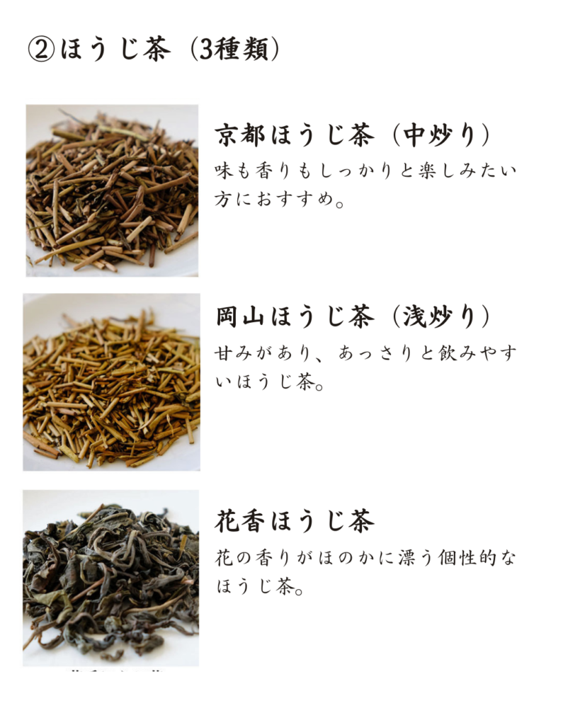→京都ほうじ茶、岡山ほうじ茶、花香ほうじ茶