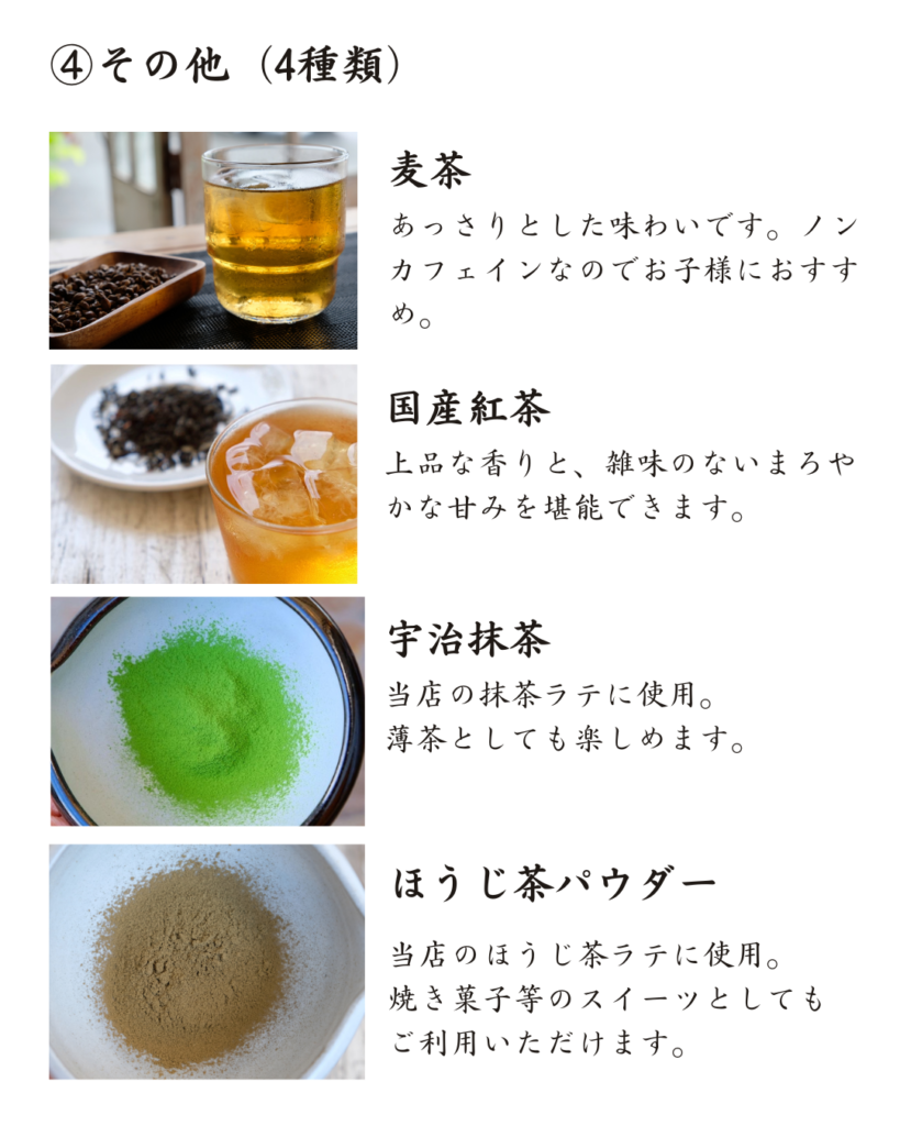 →麦茶、国産紅茶、宇治抹茶、ほうじ茶パウダー